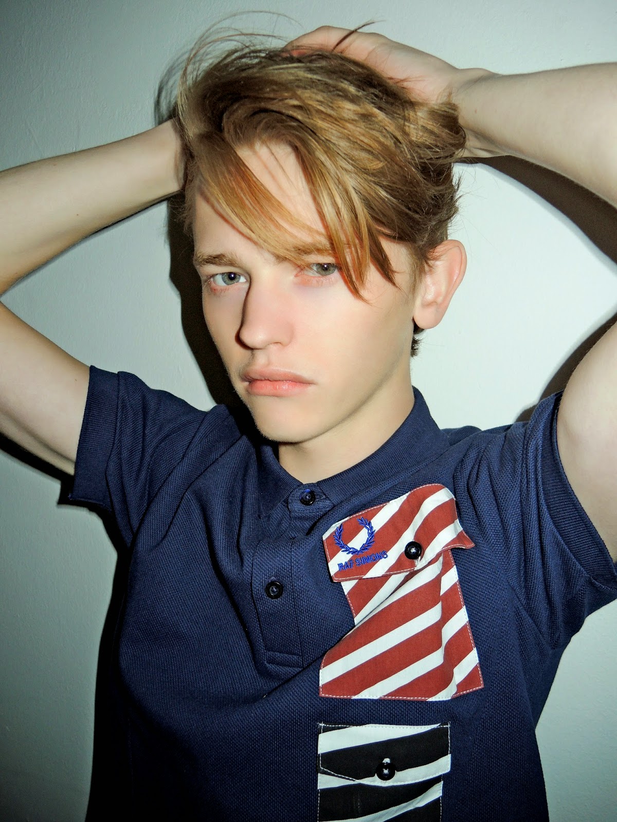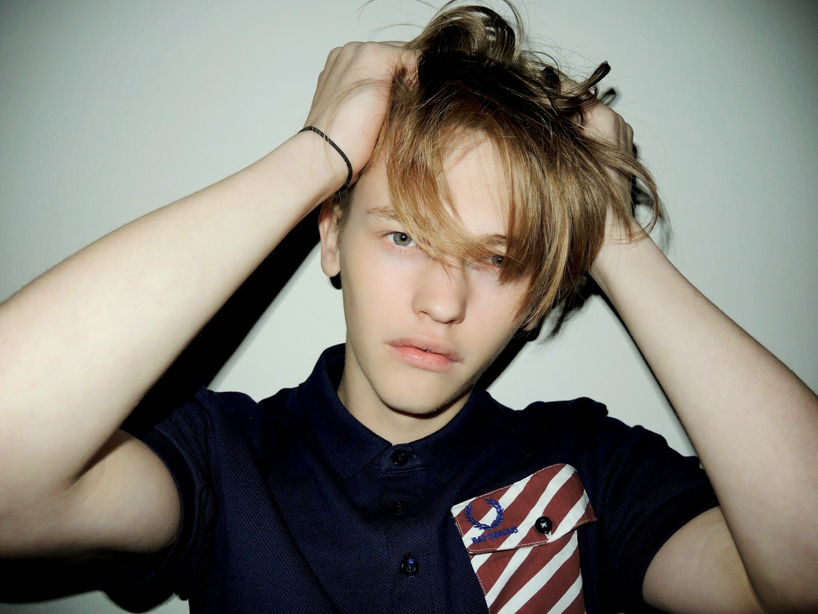 Clothing: All polo shirts and jacket by Raf Simons for Fred Perry; sweatshirt by Kenzo; plaid shirt by Dr. Martens; shiny zipper jacket by G-Star; black jeans by Baldwin Jeans; sneakers by Saint Laurent